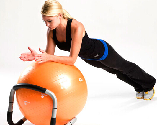用瑜伽球搭配PLANK运动,不仅能缓解手肘直接接触硬地造成的不适感,更能增加律动效果,为了防止重心不稳,建议使用瑜伽球的时候要用一个特殊的支撑工具固定。