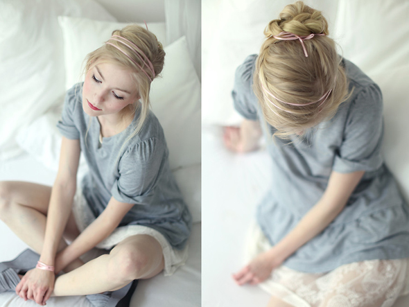 哇噢哇噢,好美的改良花苞头啊!因为用了三股辫的扎法,所以让整个面貌焕然一新,既不紧致也不蓬松,看起来恰到好处浑然天成,各种间隙仿佛都被甜美所填满,而其中若隐若现的一条粉红色丝带,更起了锦上添花的作用。