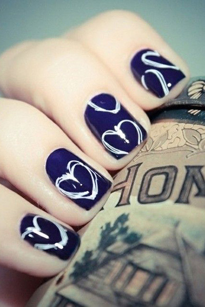 有创意的新娘就不会只甘于做肉色美甲,像这款就是用深蓝色做底,再用一些简单的线条描绘出心形,虽然简单但是很有个性。